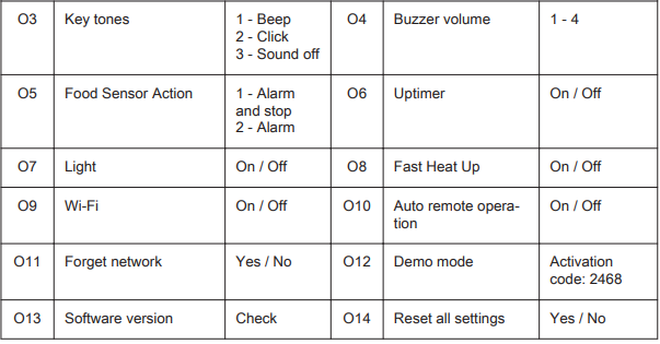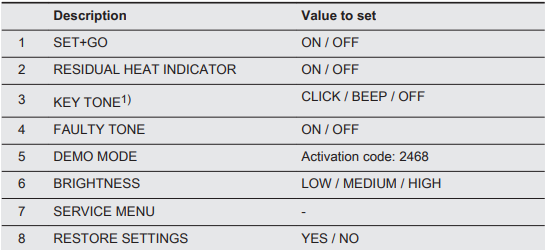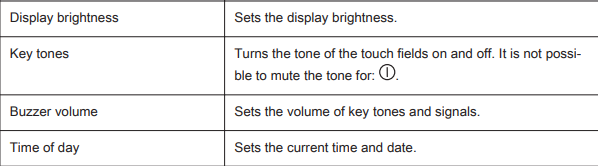 Here you can select the preferred Language, Time of Day, Key Tones, Alarm/Error tones, Buzzer Volume, Display Brightness and Water Hardness