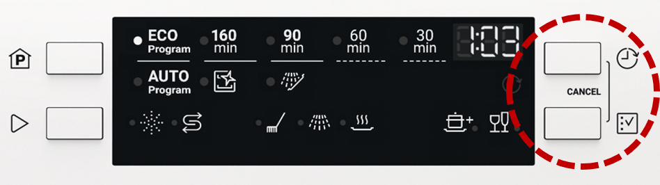On a control panel like this to reset the appliance, press and hold the Option button and the Delay button until the appliance has returned to the programme selection mode.