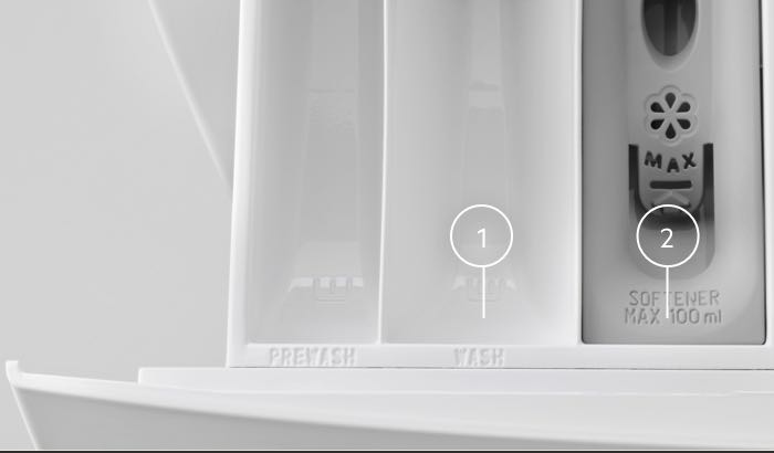 Add liquid detergent to the right compartment (1) and the water repellent agent to the fabric softener compartment (2) to introduce or restore water repellency to a garment in the last rinse. Avoid using powder detergent, softener or bleach.